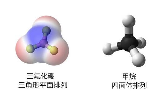 前節(jié)介紹了氯氣分子和二氧化碳分子,它們都是非極性的。對(duì)于由更多原子組成的一些分子,由于組合幾何結(jié)構(gòu)的關(guān)系,它們也往往對(duì)外顯示出極性或非極性。比如三角形平面排列的三氟化硼和四面體排列的甲烷,它們都是非極性分子,因此不會(huì)產(chǎn)生整體偶極子。