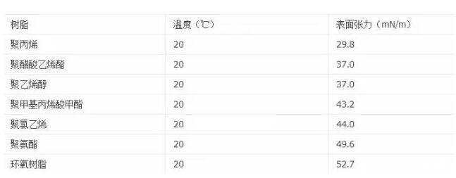 由于高分子沒有氣態(tài),即樹脂氣相的蒸氣壓為零。因此,與液態(tài)樹脂共存的只有氣相。固體樹脂表面張力的測定有很大的困難,因此,固體的表面張力一般是通過間接方法進行測定的,對于涂層而可以先測定樹脂熔體的表面張力,再根據表面張力與溫度的關系進行外推。表1列出了一些樹脂從液態(tài)外推至固體時的表面張力值。