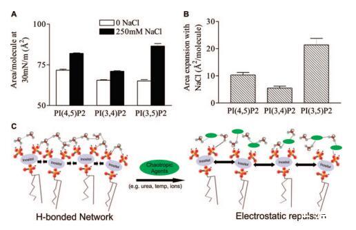 為了確定PIP2特異性膨脹是否主要由大塊肌醇環(huán)引起,同時(shí)控制?;溄M成,用磷脂酰肌醇4-磷酸(LR PI(4)P)和磷脂酰肌醇(LR PI)重復(fù)壓力面積等溫線。由于這些分子是細(xì)胞中酶促PIP2生成的前體,它們的脂肪酸組成與PIP2相似或相同,只是在肌醇環(huán)上的磷酸取代程度不同。與PIP2一樣,兩種肌醇基脂質(zhì)均未觀察到相變,平均分子面積隨著磷酸取代度的增加而增加,與之前的觀察結(jié)果一致。29然而,盡管單磷酸鹽PI(4)P與二磷酸鹽PIP2表現(xiàn)出相同的趨勢(shì),但PI和PI(4)P均未表現(xiàn)出對(duì)NaCl濃度增加的顯著擴(kuò)張,表明類(lèi)似但小得多的影響(圖2b)。這些數(shù)據(jù)表明,NaCl誘導(dǎo)PIP2單分子膜擴(kuò)張的機(jī)制與其他陰離子以及其他肌醇基脂質(zhì)相比,是PIP2特有的。