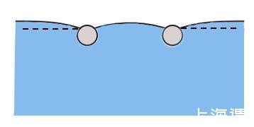麥片圈效應(yīng)中使得麥片相互吸引的因素是麥片之間的橫向毛細(xì)力(Lateral Capillary Force),橫向毛細(xì)力可分為吸引力和排斥力,這里表現(xiàn)為吸引力。我們通過一個(gè)簡單的例子,來說明一下橫向毛細(xì)力產(chǎn)生的原因。首先考慮單個(gè)小球放置在液面上保持平衡,意即在重力的作用下對(duì)液面形成一個(gè)擾動(dòng),此時(shí)若液面上存在另外一個(gè)小球時(shí),這種擾動(dòng)會(huì)相互疊加,下圖中的液面便是最終的擾動(dòng)狀態(tài)。