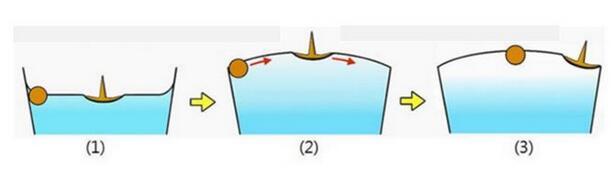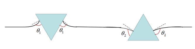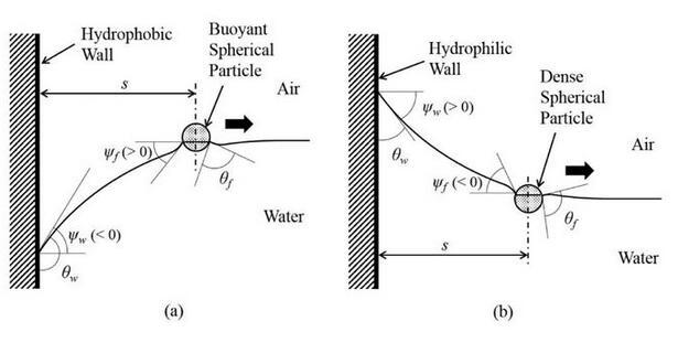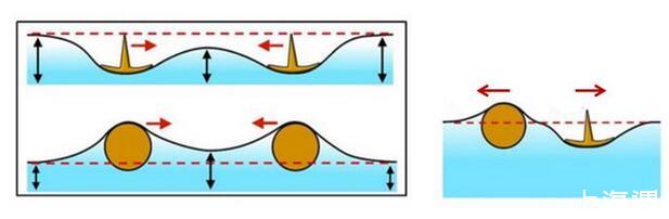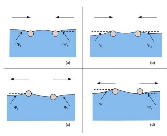 上圖便是水上兩個(gè)漂浮小球的吸引與排斥的判斷方法。值得注意的是,我們這里并沒有提及小球的浸潤性,也就是說,浸潤性與橫向毛細(xì)力的性質(zhì)并不直接相關(guān)。實(shí)際上,橫向毛細(xì)力還可以分為漂浮橫向毛細(xì)力和浸沒橫向毛細(xì)力。我們討論的情況是漂浮橫向毛細(xì)力,由小球的重力引起,題主的所說的浸潤性應(yīng)該換為小球的輕重(與水相比)。例如圖(a)里是兩個(gè)比水重的小球,表面張力將其往上拉。圖(b)是兩個(gè)比水輕的小球,表面張力將其往下拉。表面張力的方向恰好就對(duì)應(yīng)了前述接觸線處液面的傾斜角。題主的所要表達(dá)的意思其實(shí)是: