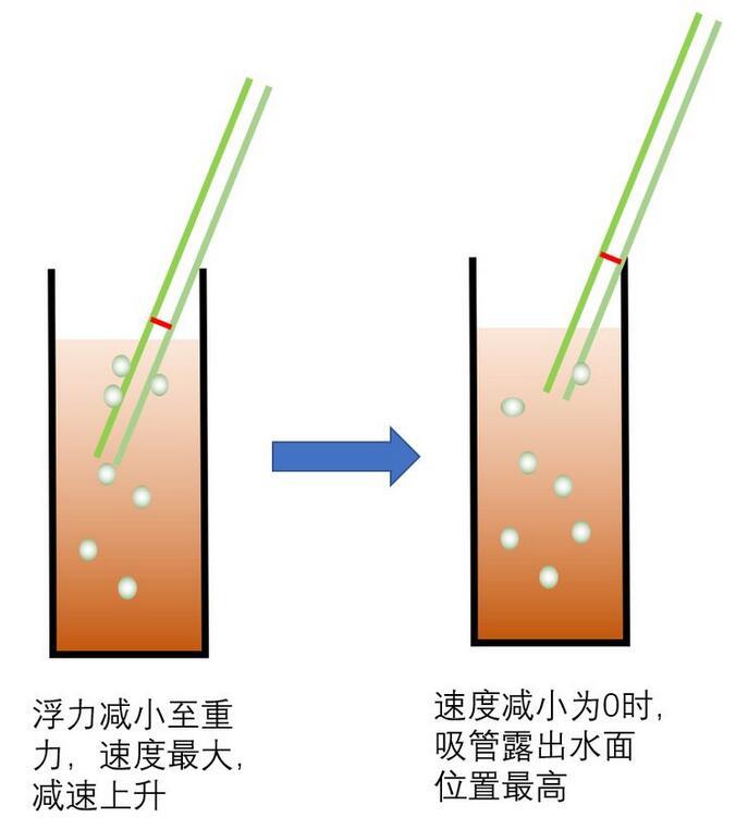 這時上升過程中,吸管可能因為左右兩側吸附的氣泡數(shù)量不同而發(fā)生浮力差異而傾斜。也可能因為外界擾動而發(fā)生傾斜,反正吸管豎直上升的可能性很小。習慣傾斜碰到瓶壁后繼續(xù)上升,上升帶來氣泡的減少,吸管自身浮力的下降。當浮力減小到小于重力時,這時開始i減速,直到速度為零。如下圖所示;