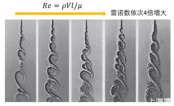 隨著雷諾實驗和雷諾數(shù)被提出來以后,近代流體力學,尤其是湍流理論的發(fā)展出現(xiàn)了一個前所未有的盛況,而粘性與湍流的關(guān)系也順理成章的轉(zhuǎn)化成了雷諾數(shù)和湍流的關(guān)系。1974年刊登于《流體力學》期刊中的一篇經(jīng)典文章,通過流動顯示技術(shù)生動形象的描繪了雷諾數(shù)和流態(tài)的關(guān)系:隨著雷諾數(shù)的增大,渦旋的整體形狀和尺度基本一致,然而射流摻混的渦系結(jié)構(gòu)卻越來越豐富。