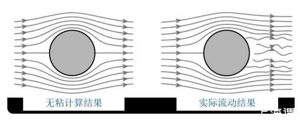歐拉提出歐拉方程后不久,人們就認識到方程中缺乏粘性項,這會導致歐拉方程的計算結(jié)果和實際產(chǎn)生偏差,比如大家熟知的達朗貝爾佯謬。下圖顯示了理想流體和實際流體下圓柱繞流的對比,可以看出,無粘流動的結(jié)果和實際存在很大的差異。因此,如何在流動方程中添加粘性項成為了跨越百年的流體力學難題。