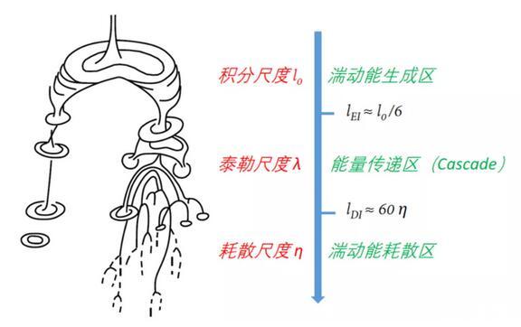 而之所以會出現(xiàn)上圖中的有趣現(xiàn)象,則要牽扯到湍流的生成、傳遞及耗散:湍流中的大渦會破碎為小渦,小渦再破碎為更小的“迷你渦”,然后逐漸耗散,這個過程與當?shù)乩字Z數(shù)相關(guān)。當“迷你渦”變得足夠小時,根據(jù)角動量守恒,渦的角速度將會非常大,意味著局部速度剪切很強,粘性就變得舉足輕重了,于是,“迷你渦”就這樣被粘性耗散掉了。事實上,渦的尺度足夠小時,體現(xiàn)為當?shù)乩字Z數(shù)非常小,粘性力對流體的影響則顯著大于慣性力。