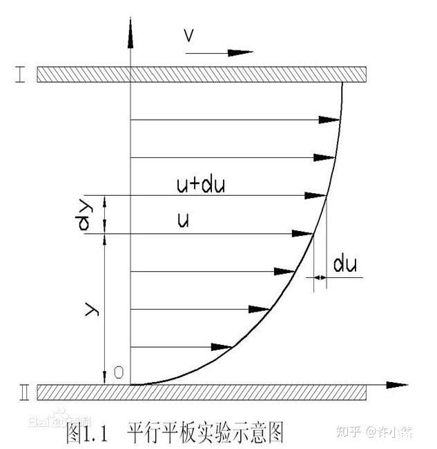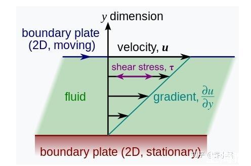 在這張圖中,下方的平板和兩個平板間的液體保持相對靜止,且液體內(nèi)部沒有對自身體內(nèi)不同質(zhì)點的相對流動,而將上方平板做水平向右的推動??梢钥匆姡谂c上方平板直接接觸的一層液面處可以達到與被推動的平板相同的速度,而在垂直距離上越遠離上層平板的部分的速度越慢,直到最下層與下方平板直接接觸的液面處速度為零,在兩個平板之間存在一個連續(xù)變化的速度分布。