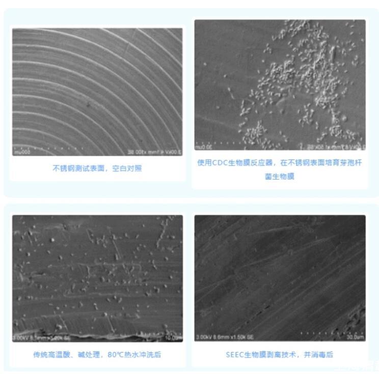 上圖可見,高溫或傳統(tǒng)強(qiáng)酸、強(qiáng)堿工藝處理生物膜,效果不理想。高溫、強(qiáng)酸或強(qiáng)堿無(wú)法有效清除已粘附于系統(tǒng)上的生物膜,且無(wú)法對(duì)生物膜下微生物進(jìn)行有效殺滅。因傳統(tǒng)方法清除生物膜效果不理想,研究表明,過氧化氫在控制生物膜方面要比氯更有效,過氧化氫通過極強(qiáng)的氧化作用穿透細(xì)胞壁和生物被膜,破壞細(xì)菌的dna,從而杜絕生物膜的產(chǎn)生。