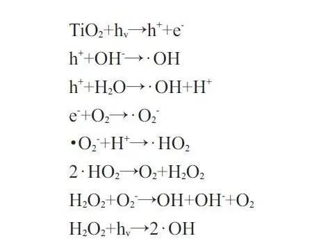根據(jù)價(jià)帶理論,Ti O2為光催化劑,當(dāng)吸收大于其帶隙的光能時(shí),電子從價(jià)帶激發(fā)到導(dǎo)帶,產(chǎn)生電子(e-)-空穴(h+)對(duì),這些放電載體可以快速遷移到催化劑顆粒的表面,在那里它們最終被捕獲并且與合適的底物發(fā)生氧化還原反應(yīng)。反應(yīng)式如下: