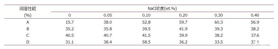 表3.含有不同濃度NaCl的抑塵劑與煤塵NR的潤(rùn)濕性能