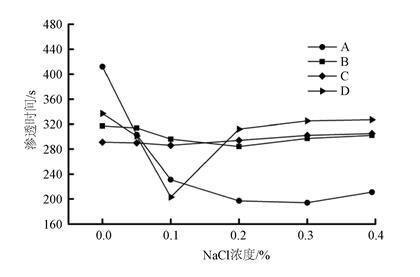 圖5.不同濃度NaCl對(duì)0.2 wt.%不同類型抑塵劑的滲透性影響