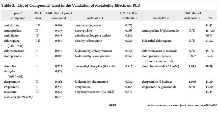 已經(jīng)有許多出版物描述了PLD藥物代謝產(chǎn)物所致。其中,初級(jí)代謝輕的胺碘酮,去乙基胺碘酮,已經(jīng)討論過(guò)14,38-40優(yōu)先積累代謝物已觀察到胺碘酮過(guò)量,尤其是短期39這為我們的檢測(cè)數(shù)據(jù)提供了可能的解釋其中去乙基胺碘酮是胺碘酮的主要代謝物,41,42表現(xiàn)出更高的PLD誘導(dǎo)潛力。相似地,8-羥基米安色林之間的CMC位移差異,米安色林、43,44和米安色林的主要氧化代謝物比其他兩個(gè)之間的差異更顯著成對(duì)的親本和代謝物。由于溶解度的限制,父母和代謝組的劑量濃度不同氯氮平和米安色林。這可能是導(dǎo)致觀察到的CMC偏移的顯著差異母體和代謝物之間。在較低濃度下測(cè)試時(shí)相比之下,氯氮平從低電位誘導(dǎo)劑轉(zhuǎn)變?yōu)榉钦T導(dǎo)劑,而米安色林仍然作為誘導(dǎo)劑但具有更高的CMCDL/CMCL值。值得注意的是,目前測(cè)試集中的大多數(shù)CAD被報(bào)告為氧化代謝其相應(yīng)的脫烷基初級(jí)代謝物。為了了解相應(yīng)初級(jí)的PLD電位代謝物,我們測(cè)試了額外的代謝物。之間測(cè)試的代謝物是初級(jí)去甲基代謝物氯丙嗪、45?47阿米替林、48?50丙咪嗪、43,50和pri-氯喹的瑪麗和次級(jí)脫乙基代謝物。51,52此外,由雜原子氧化形成的氧化代謝物地昔帕明43,50和氯胺酮的重釋和脫烷基代謝物pramine53,54進(jìn)行了評(píng)估。與其他CAD一樣,代謝物可以如果它們具有合適的理化性質(zhì),則誘導(dǎo)PLD。32相反,代謝物將失去結(jié)合能力如果CAD特征丟失,則使用脂質(zhì),例如用脂質(zhì)觀察氯米帕明N-氧化物和地昔帕明N-羥基(圖4和表2)。