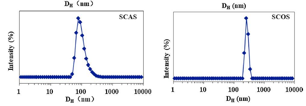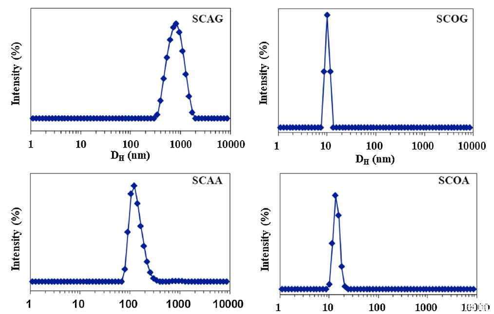用DLS測(cè)量在6種?;被岜砻婊钚詣┧芤褐行纬傻木奂w的大小和分布,其CMC為5倍,5×CMC。圖2顯示了它們的表觀等效流體動(dòng)力學(xué)直徑(DH)。除絲氨酸外,蓖麻油表面活性劑的DH分布普遍大于棉籽油表面活性劑的DH分布。SCAG和SCAA的DH分布分別集中在900和150 nm,而SCOG和SCOA聚集體的直徑約為10 nm。對(duì)于絲氨酸,SCAS和SCOS的平均DH值分別約為100 nm和250 nm。這些結(jié)果可以通過(guò)蓖麻油衍生的表面活性劑的蓖麻油基和絲氨酸頭部基團(tuán)上都存在-OH基團(tuán)來(lái)解釋?zhuān)龠M(jìn)了大聚集體,例如囊泡的形成(圖2)。