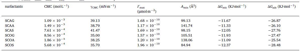 表1顯示合成表面活性劑的CMC值在0.568-1.86 mM范圍內(nèi)。與其他表面活性劑相比,帶有最疏水丙氨酸殘基的表面活性劑(SCAA和SCOA)具有相對(duì)較高的CMC。SCAA頭部區(qū)域的強(qiáng)疏水性和SCOA可能會(huì)阻礙膠束界面區(qū)域的水/頭基相互作用,從而增加它們的CMC。γCMC的值在35.00到41.47 mN·m-1之間,棉籽油衍生的表面活性劑的γCMC值普遍低于衍生的表面活性劑的γCMC值來(lái)自具有相同頭部基團(tuán)的蓖麻油。SCOS獲得了最高Γmax值和最低Amin值,表明在其頭部基團(tuán)上帶有-OH基團(tuán)的SCOS單體在空氣/水界面上更緊密地堆積。鑒于蓖麻油衍生的表面活性劑疏水尾部存在-OH基團(tuán),我們得出結(jié)論,頭部基團(tuán)上的-OH基團(tuán)與尾部的表現(xiàn)不同。所有表面活性劑的ΔGmic和ΔGads的負(fù)值意味著兩者在水中的膠束化在298.15 K下,空氣/水界面處的吸附是自發(fā)過(guò)程。對(duì)于SCOS也獲得了最大的ΔGads和ΔGmic絕對(duì)值,表明絲氨酸殘基上的-OH基團(tuán)有助于膠束化和吸附。