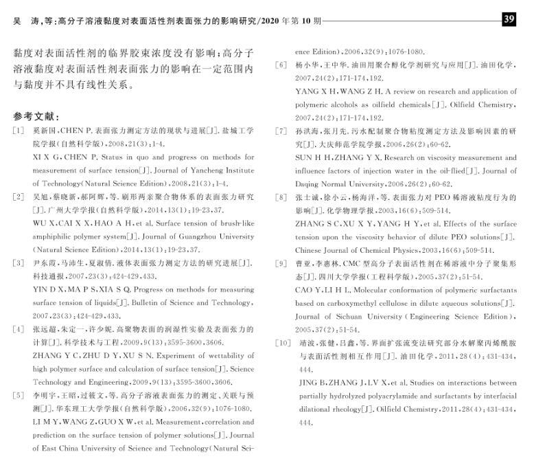 為了揭示高分子溶液黏度對(duì)表面活性劑表面張力的影響程度及規(guī)律,利用全自動(dòng)張力儀,通過Wilhelmy吊片法測(cè)定了4種表面活性劑(SDS、SDBS、油酸鈉、OP-10)水溶液的臨界膠束濃度以及加入不同黏度高分子(羧甲基纖維素、多元醇聚合物)溶液前后的表面張力。結(jié)果表明:加入不同黏度高分子溶液后,4種表面活性劑的臨界膠束濃度并沒有發(fā)生變化,但臨界膠束濃度對(duì)應(yīng)的表面張力均有小幅提升,且高分子溶液黏度對(duì)表面活性劑表面張力的影響在一定范圍內(nèi)與黏度并無明顯的線性關(guān)系;在加入黏度為14 mPa·s的羧甲基纖維素溶液后,SDS、SDBS、油酸鈉、OP-10在臨界膠束濃度對(duì)應(yīng)的表面張力分別為36.60 mN·m~(-1)、40.06 mN·m~(-1)、54.30 mN·m~(-1)、44.05 mN·m~(-1)。