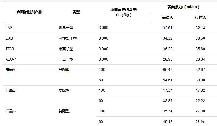 對于溶液而言,表面活性劑的存在能顯著降低表面張力,本文研究了不同表面活性劑溶液,同一含量下,兩種方法測試結果的差異以及同一表面活性劑溶液,不同含量下兩種方法測試結果的差異。所有方法按規(guī)范操作執(zhí)行,測試溫度25℃,平行測定5次取算數平均值,比較結果如表2所示。