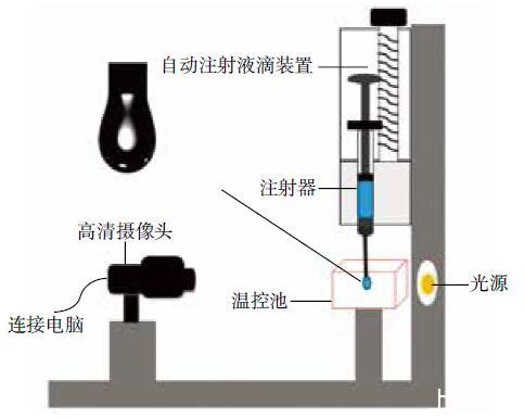懸滴法是利用滴外形測定表面張力的一種方法,基于數字成像技術,是一種現代的完全數字、計算機化的方法,是一種絕對的測量方法[13,14,15]。該種方法簡單、直觀、誤差小,往往只需準確校正圖像放大比例,且可同時評估靜態(tài)表面張力及動態(tài)表面張力。