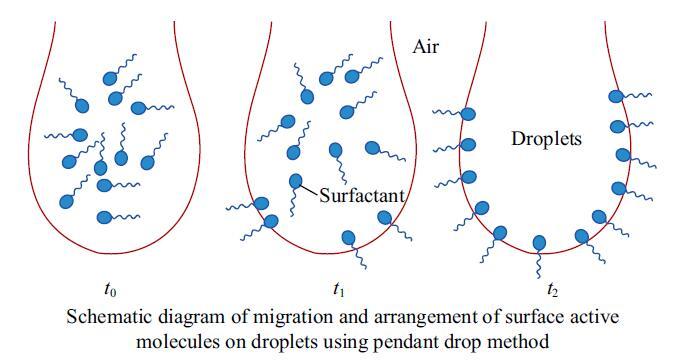 結果表明,在動態(tài)表面張力曲線圖中,A,B,C三種樣品在60 mg/kg的較低含量下,表面張力均呈現先快速降低而后緩慢降低最終達到平衡的趨勢,表明表面活性劑分子在液滴表面上確實存在著隨時間變化逐漸吸附平衡,排列完整的現象,如圖4所示,表面活性劑分子在表面完全吸附、排列緊密需要一定的時間,顯然在使用懸滴法進行測定時,時間效應直接影響著表面張力測定的誤差大小,符合前文所述結論。而樣品B在100 mg/kg含量下,動態(tài)表面張力趨勢圖成一條直線,證明該種表面活性劑在液滴表面遷移速度較快,在液滴完全注射形成之前已快速到達平衡狀態(tài),表面活性劑分子在表面得以充分排布,這解釋了較低含量的表面活性劑溶液的靜態(tài)表面張力與國標推薦方法吻合程度差異較大的原因。這是由表面活性劑分子自身性質所決定的,與其極性基的類型、結構、個數、疏水基長度等息息相關。而單一液體,未具有含量差,故不存在表面活性劑分子從溶劑內部遷移吸附至表面這一過程,所以其動態(tài)表面張力曲線呈現為平穩(wěn)直線。