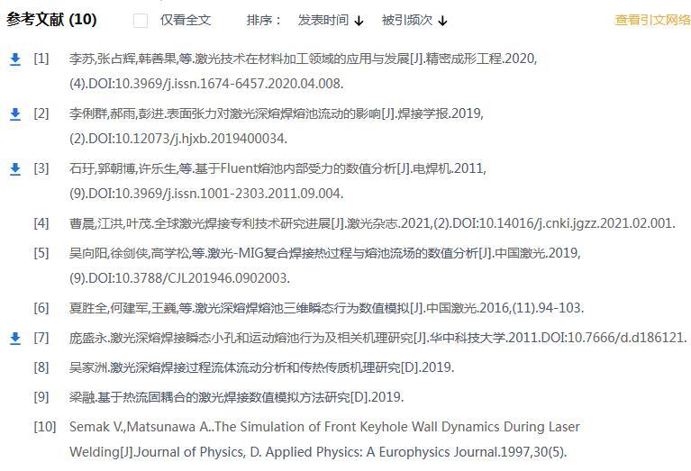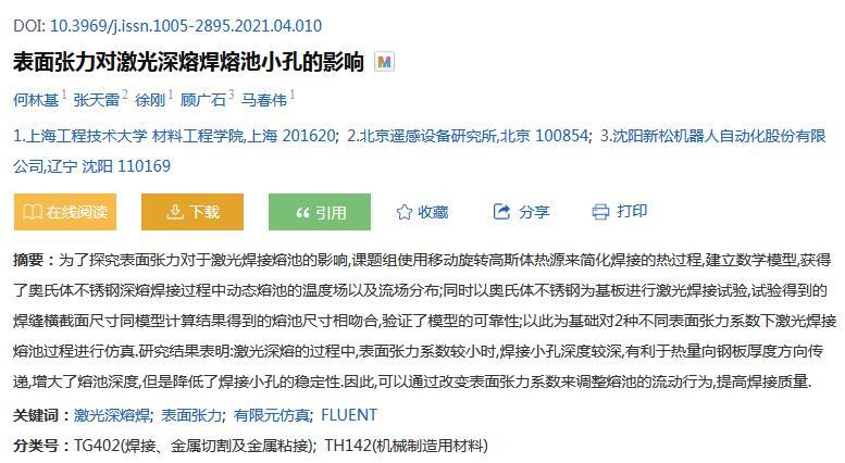 【摘要】:為了探究表面張力對(duì)于激光焊接熔池的影響,課題組使用移動(dòng)旋轉(zhuǎn)高斯體熱源來(lái)簡(jiǎn)化焊接的熱過(guò)程,建立數(shù)學(xué)模型,獲得了奧氏體不銹鋼深熔焊接過(guò)程中動(dòng)態(tài)熔池的溫度場(chǎng)以及流場(chǎng)分布;同時(shí)以?shī)W氏體不銹鋼為基板進(jìn)行激光焊接試驗(yàn),試驗(yàn)得到的焊縫橫截面尺寸同模型計(jì)算結(jié)果得到的熔池尺寸相吻合,驗(yàn)證了模型的可靠性;以此為基礎(chǔ)對(duì)2種不同表面張力系數(shù)下激光焊接熔池過(guò)程進(jìn)行仿真。