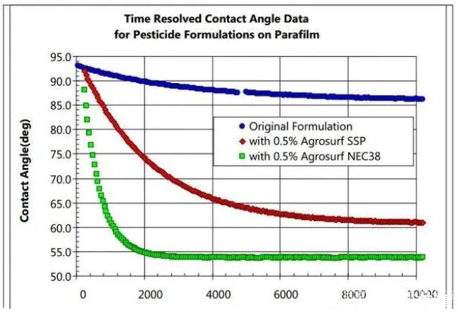 農(nóng)藥噴灑到植物葉片后,可以用接觸角來(lái)判別藥液在葉片表面的潤(rùn)濕程度。接觸角越小,藥液在植物葉面上的持留就會(huì)越好。但如果接觸角過(guò)小,就會(huì)造成藥液在植物葉面上的過(guò)于展開(kāi)和潤(rùn)濕,形成過(guò)薄的藥膜而流失。例如用DSA25接觸角測(cè)試儀測(cè)試的農(nóng)藥初始接觸角為86度,而添加了表面活性劑的農(nóng)藥后,接觸角很快降低到50-60度。