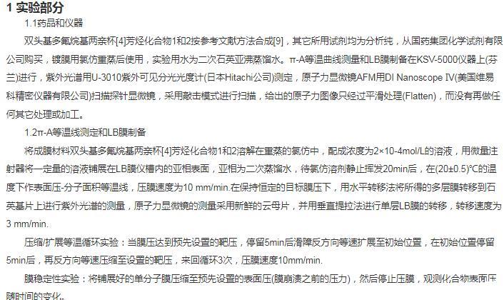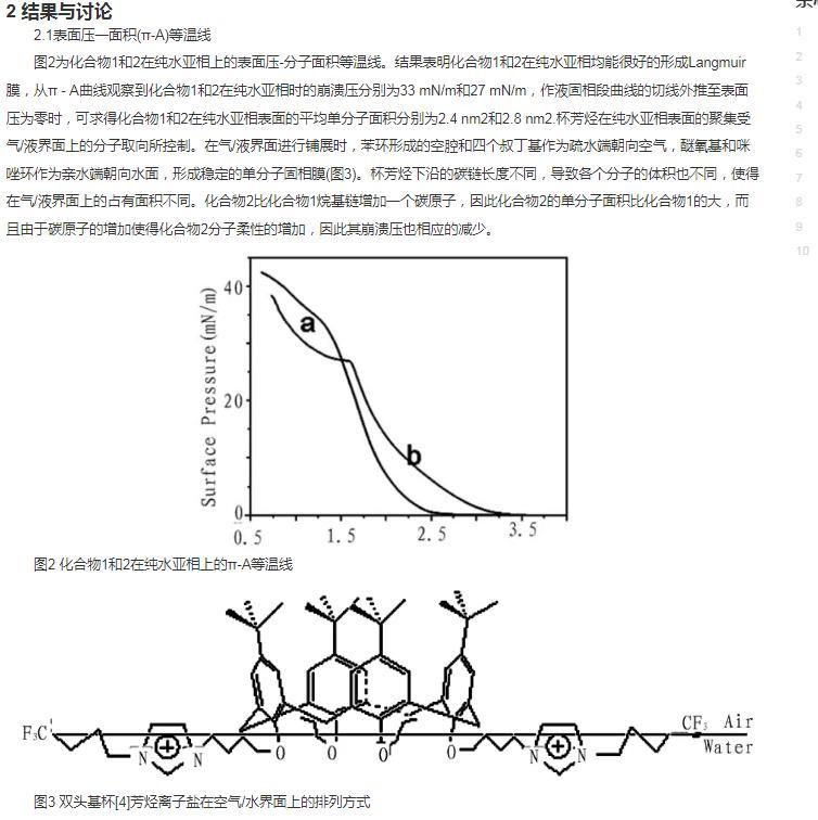 Langmuir-Blodgett膜技術(shù)(LB膜)是一種精確控制薄膜厚度和分子排列的單分子膜沉積技術(shù),即在水氣界面上能將成膜材料分子加以緊密有序地排列,形成單分子層,然后再轉(zhuǎn)移到固體襯底上的制膜技術(shù),利用該技術(shù)可以將功能化合物的光學(xué)、電磁學(xué)、分子識別與催化等性質(zhì)轉(zhuǎn)移到膜材料中。杯芳烴是繼環(huán)糊精、冠醚之后出現(xiàn)的第三代超分子主體分子,它具有空腔可調(diào)節(jié),構(gòu)象可變換,并易于化學(xué)改性和修飾等特點(diǎn),特別是對它進(jìn)行適當(dāng)修飾以后的化合物在材料化學(xué),配位化學(xué),生物化學(xué)等領(lǐng)域表現(xiàn)出潛在的應(yīng)用前景與研究價(jià)值?;谏鲜稣J(rèn)識最近我們合成了雙頭基多氟烷基兩親杯芳烴化合物1和2(圖1),并對該化合物在空氣/水相界面的成膜性能以及LB膜的結(jié)構(gòu)進(jìn)行了研究。