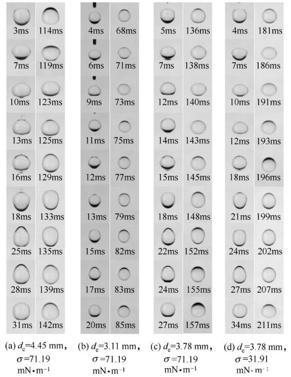 液滴運(yùn)動(dòng)過(guò)程中的形狀變化對(duì)液滴的蒸發(fā)、燃燒等過(guò)程有重要影響,表面張力是影響其形狀變化的因素之一。為研究表面張力對(duì)液滴形變的影響規(guī)律,采用低濃度的表面活性劑(十二烷基苯磺酸鈉SDBS)配制表面張力為30~72 mN·m?1的水溶液。利用不同外徑的針管得到3~5 mm粒徑的液滴。高速攝像機(jī)(Phantom V211,1000 pps,800×600 pixel)對(duì)這些液滴在自由落體過(guò)程中的形變規(guī)律進(jìn)行了可視化實(shí)驗(yàn)研究,得到了關(guān)于E?tv?s數(shù)(Eo)的半經(jīng)驗(yàn)關(guān)系式。實(shí)驗(yàn)結(jié)果表明,液滴在自由落體過(guò)程中會(huì)形成周期性振動(dòng)形變,振動(dòng)周期和振幅隨表面張力增大而減小。進(jìn)一步研究發(fā)現(xiàn),初始時(shí)液滴形成并斷裂所引起的瞬態(tài)沖量使液滴內(nèi)部動(dòng)量傳遞進(jìn)而表現(xiàn)出周期性振動(dòng)形變。