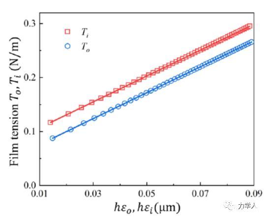 基于該平衡構型的解析解,本研究發(fā)現(xiàn)薄膜在接觸線附近的彈性應變可以由薄膜的鼓包角解析給出。由此,本文給出了在一般條件下,薄膜在接觸線附近的彈性應變隨鼓包角的解析關系。圖3表明,基于該解析關系給出的薄膜彈性應變可以很好的描述薄膜總張力隨薄膜厚度及接觸線附近應變的演化規(guī)律?;诖?,本文提出了采用線性外推薄膜總張力隨薄膜厚度和接觸線附近薄膜應變乘積的方法來確定固體表面張力的方案。