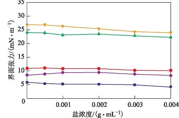 圖4水相鹽濃度對油水界面張力的影響飽和分;▲—芳香分;●—膠質(zhì);■—瀝青質(zhì);◆—380號燃料油