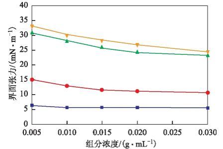 圖1 380號燃料油中四組分的油水界面張力曲線飽和分;▲—芳香分;●—膠質(zhì);■—瀝青質(zhì)