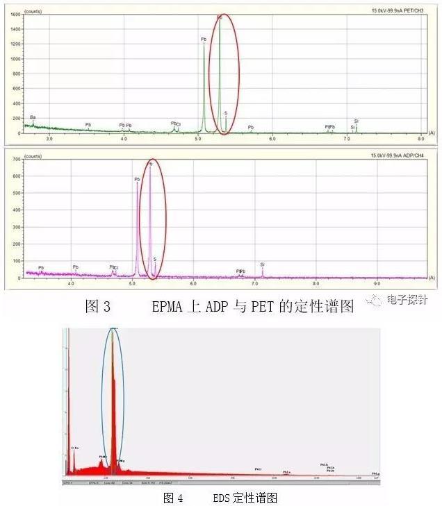 結(jié)果顯示無論是EPMA-1720上的ADP晶體還是PET晶體,其分辨率都毫無疑問地能把S Ka(特征波長0.5373nm)和Pb Ma(特征波長0.5285nm)明顯的區(qū)分開來,呈現(xiàn)的是分開的兩個(gè)峰,見圖3中的紅色線內(nèi)。而相同測試條件下的EDS譜圖中S Ka峰(特征能量2.308keV)已然不能使用軟件自動(dòng)識別標(biāo)出,手動(dòng)添加的結(jié)果見圖4,其與Pb的Ma峰(特征能量2.343keV)重疊在一起,不能分開。