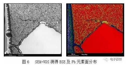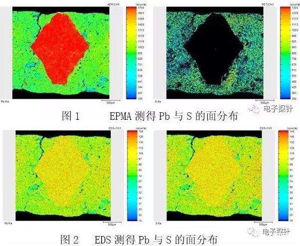 圖2為EDS測試結(jié)果,顯示Pb與S元素分布區(qū)域基本一致的現(xiàn)象,此為假象。這是由于兩個(gè)元素的主峰相互重疊,在能量上已不能被儀器區(qū)分開的緣故。