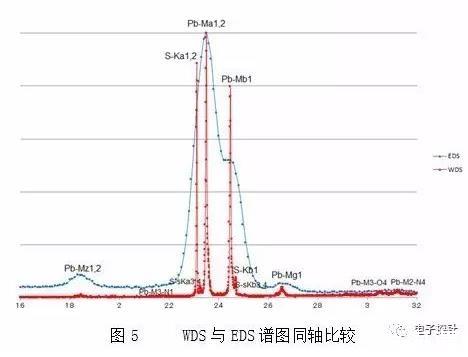 我們把此兩個(gè)譜圖放到一個(gè)坐標(biāo)軸上就能更好的對比,組合中圖5的橫軸為能量(單位keV),WDS的分辨率比EDS高出一個(gè)數(shù)量級。